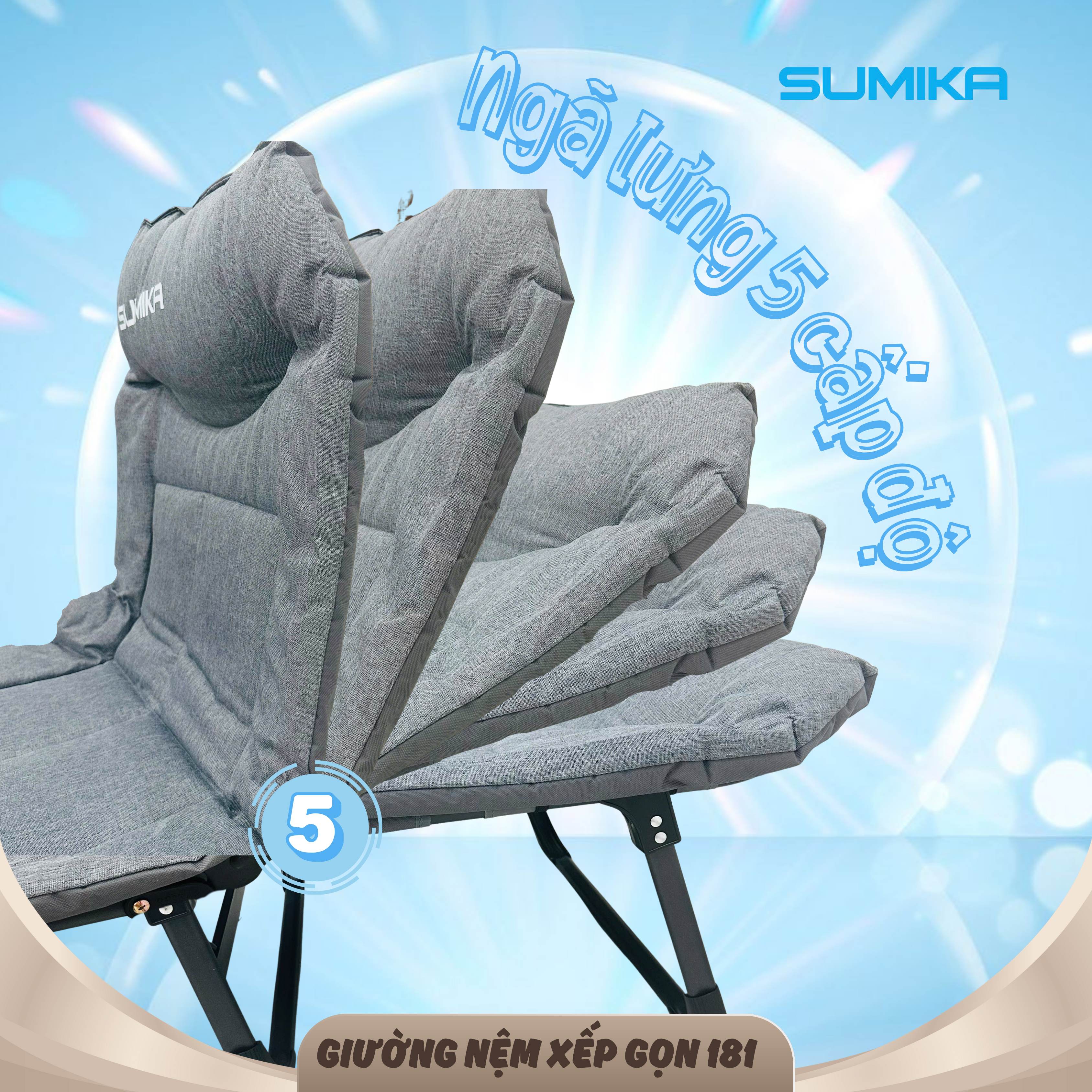 - Bên trên giường xếp Sumika 181 là tấm nệm êm, độ bền cao, thoáng khí, dễ dàng tháo rời để vệ sinh. Đi kèm là thiết kế túi vải ở bên hông để đựng các vật dụng cá nhân tiện dụng.