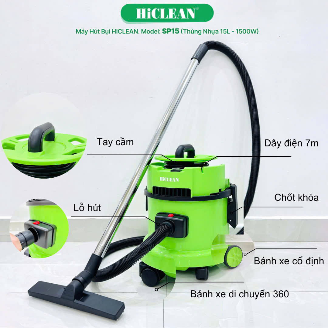 - Máy hút bụi gia đình HiClean SP15 có khả năng hút nước và hút khô cùng các bụi bẩn một cách nhanh chóng, mang lại hiệu quả cao.