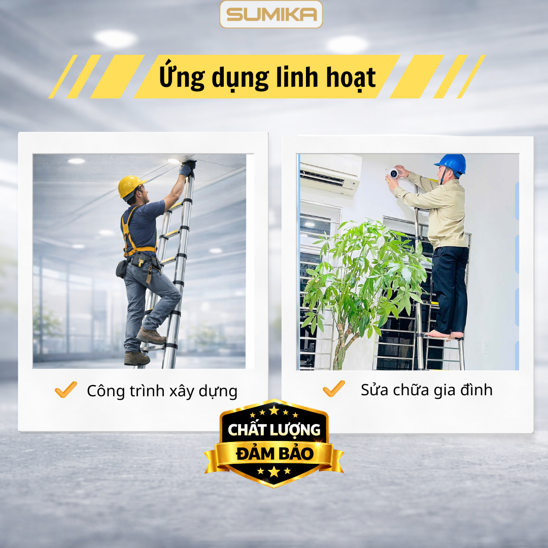 Chiếc thang này có đặc điểm gì nổi bật mà lại được người tiêu dùng ưa chuộng đến vậy? Hãy cùng SUMIKA tìm hiểu ngay bây giờ nhé. Tùy vào mục đích sử dụng mà mỗi khách hàng có sự lựa chọn riêng cho chính mình. Để đáp ứng mọi nhu cầu của người tiêu dùng Sumika đã cho ra đời thang inox rút với nhiều chiều cao khác nhau. Đối với thang rút T380 chiều cao tối của nó là 3.8m gồm 13 bậc, đây là chiều cao vừa phải không quá ngắn hoặc quá dài. Chính vì vậy thang không những sử dụng hữu ích trong gia đình mà còn được dùng cả trong các công trình, nhà máy xí nghiệp. Chiều cao rút gọn của thang rút inox giá rẻ chỉ 0.83m và chỉ nặng 12.2kg bạn có thể di chuyển thang đến địa chỉ nào nào mà bạn muốn.