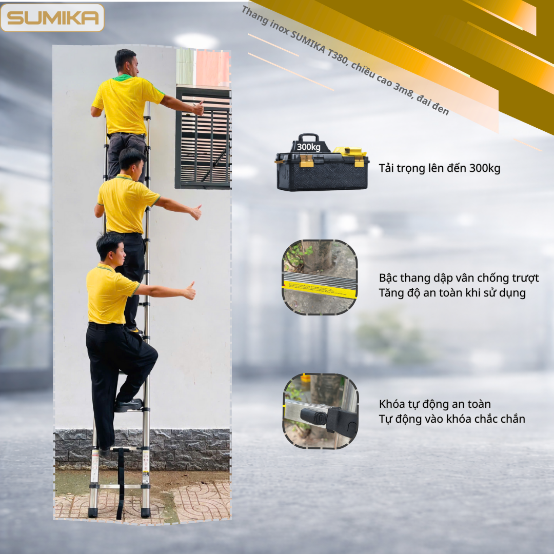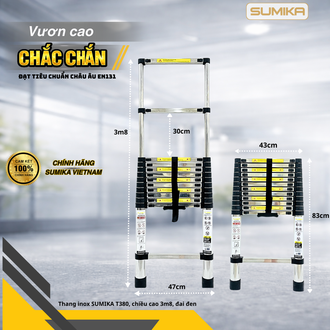Thang Rút Inox SUMIKA Model: T380 - Kích thước: 86.5x47.5x9cm - Chiều cao tối đa: 3.8m - Chiều dài rút gọn: 0.83m - Trọng lượng: 12.2kg - Số bậc: 13 bậc - Độ dày inox: 1mm - Tải trọng 300kg. - Khoảng cách bậc: 30cm. - Đạt tiêu chuẩn EN131